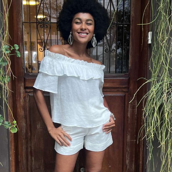 Blusa em tecido Visco Linho texturizado, modelagem cropped, modelo ciganinha, decote reto com babado, manga 3/4, detalhe de recorte superior sobreposto, barra lenço.