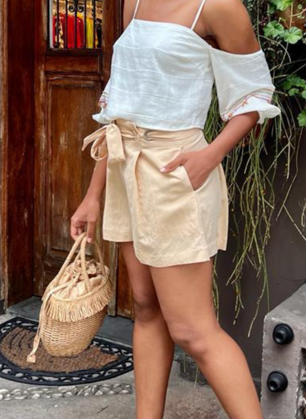 Blusa em tecido Visco Linho texturizado, modelagem cropped, estilo ciganinha, alças finas com recorte vazado nos ombros, manga 3/4 com elástico no punho, detalhe de miçanga bordada a mão na manga..