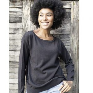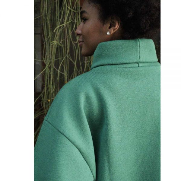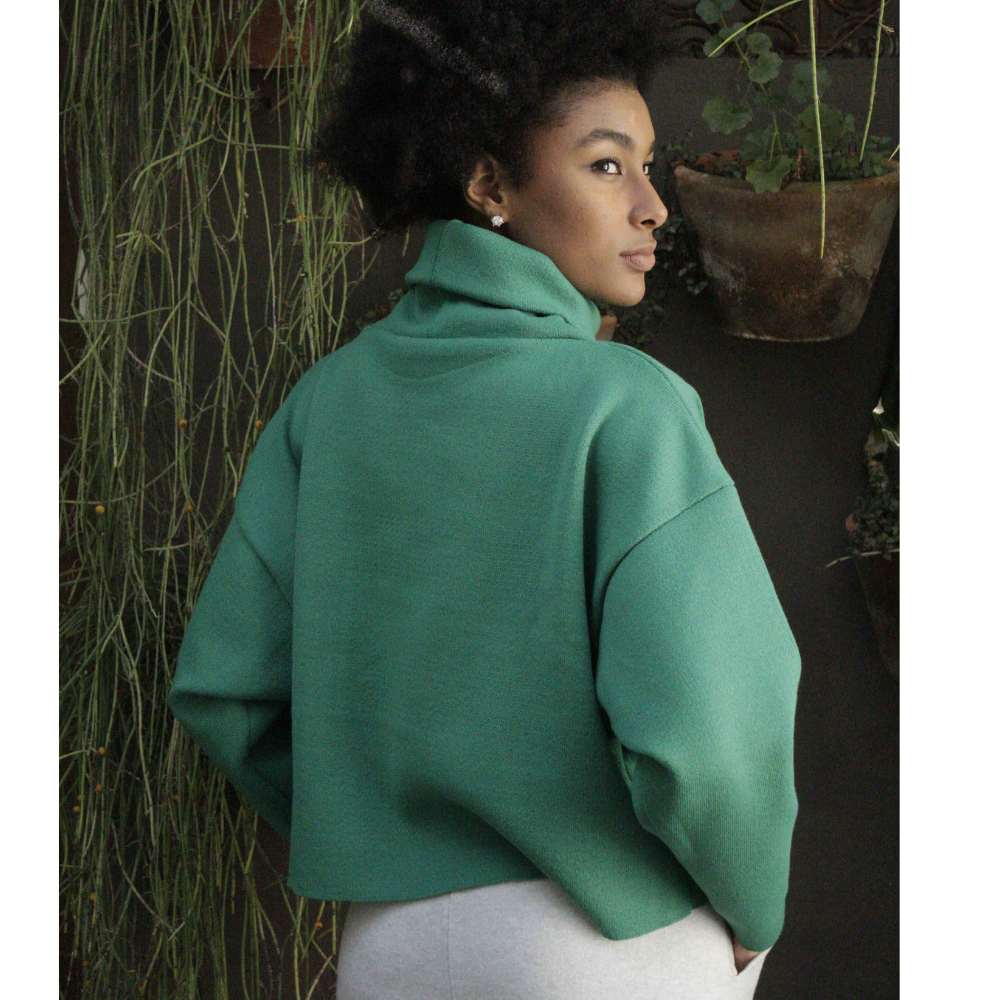 Blusa cropped com modelagem ampla, gola boba, manga longa com cava deslocada, barra a laser.