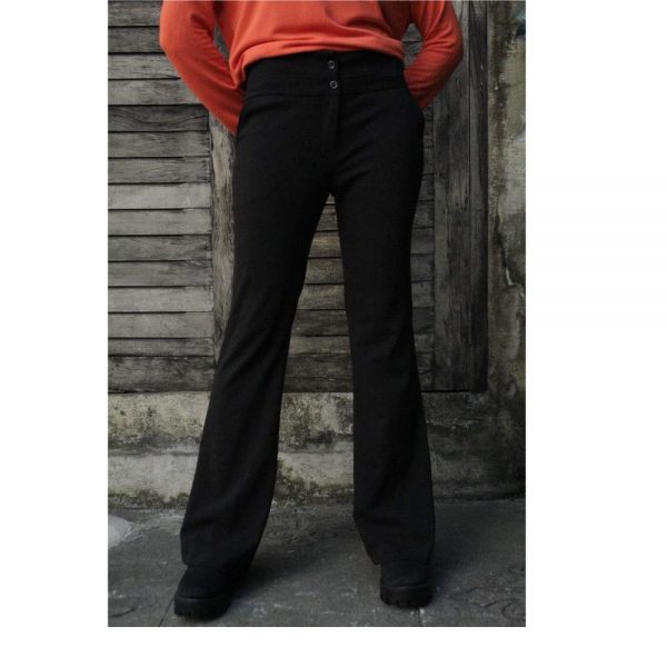 Calça flare alfaiataria, cós alto aplicado, fechamento frontal por zíper e botões, bolsos invisíveis, barra simples.
