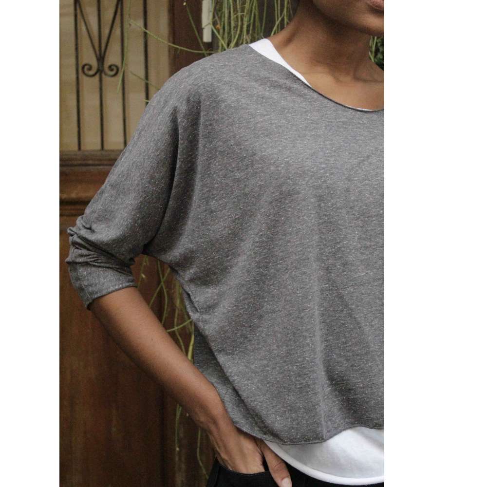 Conjunto de blusa e regata. Regata em malha, decote arredondado, barra á fio. Blusa: modelagem reta, em tecido mescla, decote arredondado, manga 7/8 morcego, barra lenço.