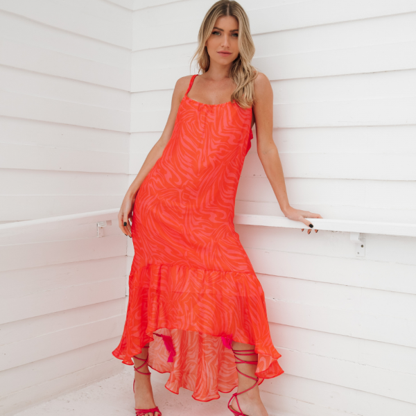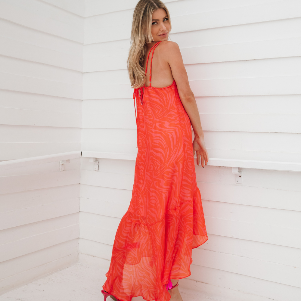 Vestido longo mullet, com decote canoa, alças cruzadas e ajustáveis, com forro e shape solto.